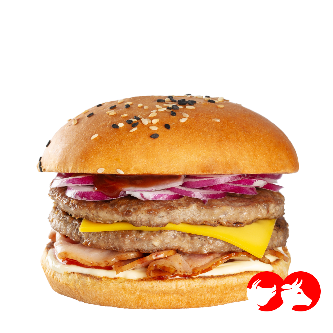 Бургер с двумя сочными котлетами из говядины, ломтиком сыра чеддер, поджаренным беконом, свежими помидорами и ялтинским луком, в пышной булочке бриошь пропитанной пикантным соусом релишь и барбекю.