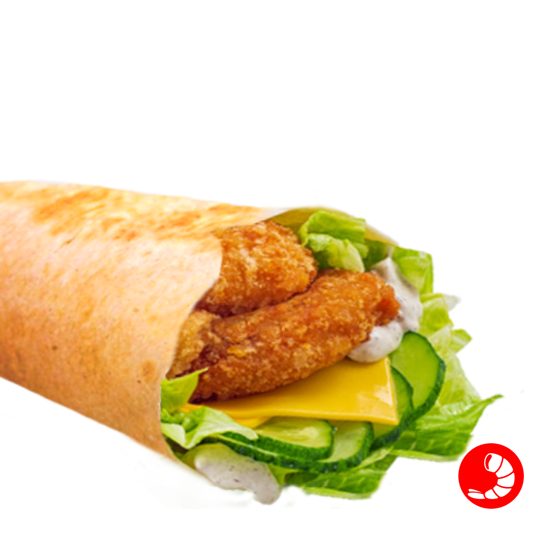 Ролл с сочными креветками в панировке, ломтиком сыра чеддер, свежими огурцами и салатом айсберг. Все это в пшеничной тортилье, под соусом тар-тар.