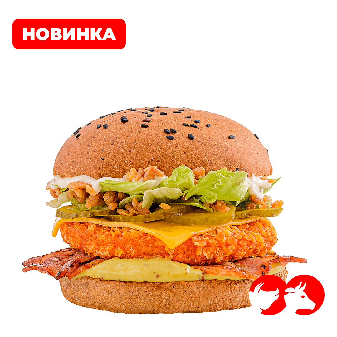 Бургер с хрустящей куриной котлетой, ломтиком сыра чеддер, салатом айсберг, кусочками свежего огурца и помидора. Всё это в булочке с кунжутом, пропитанной пикантным соусом релишь.