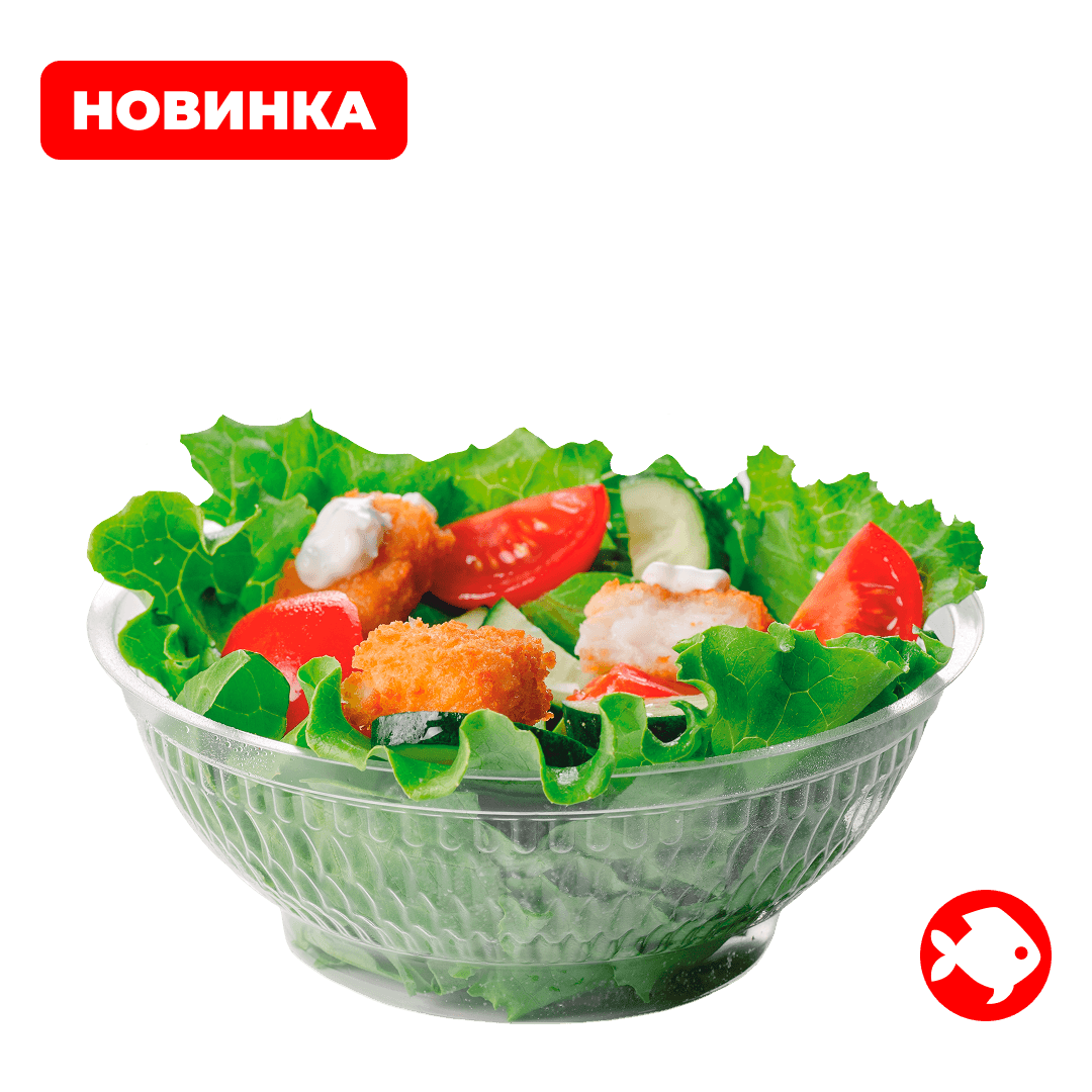 Хрустящие листья салата айсберг с сочными помидорами черри, слайсами огурца, нежнейшим филе минтая, заправленные соусом тар-тар.
